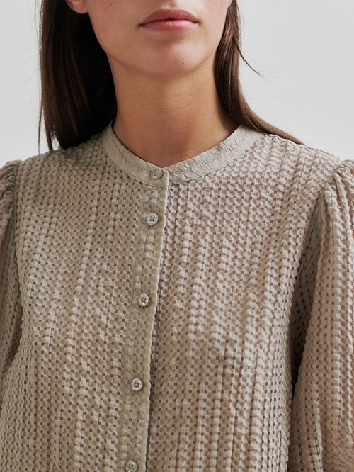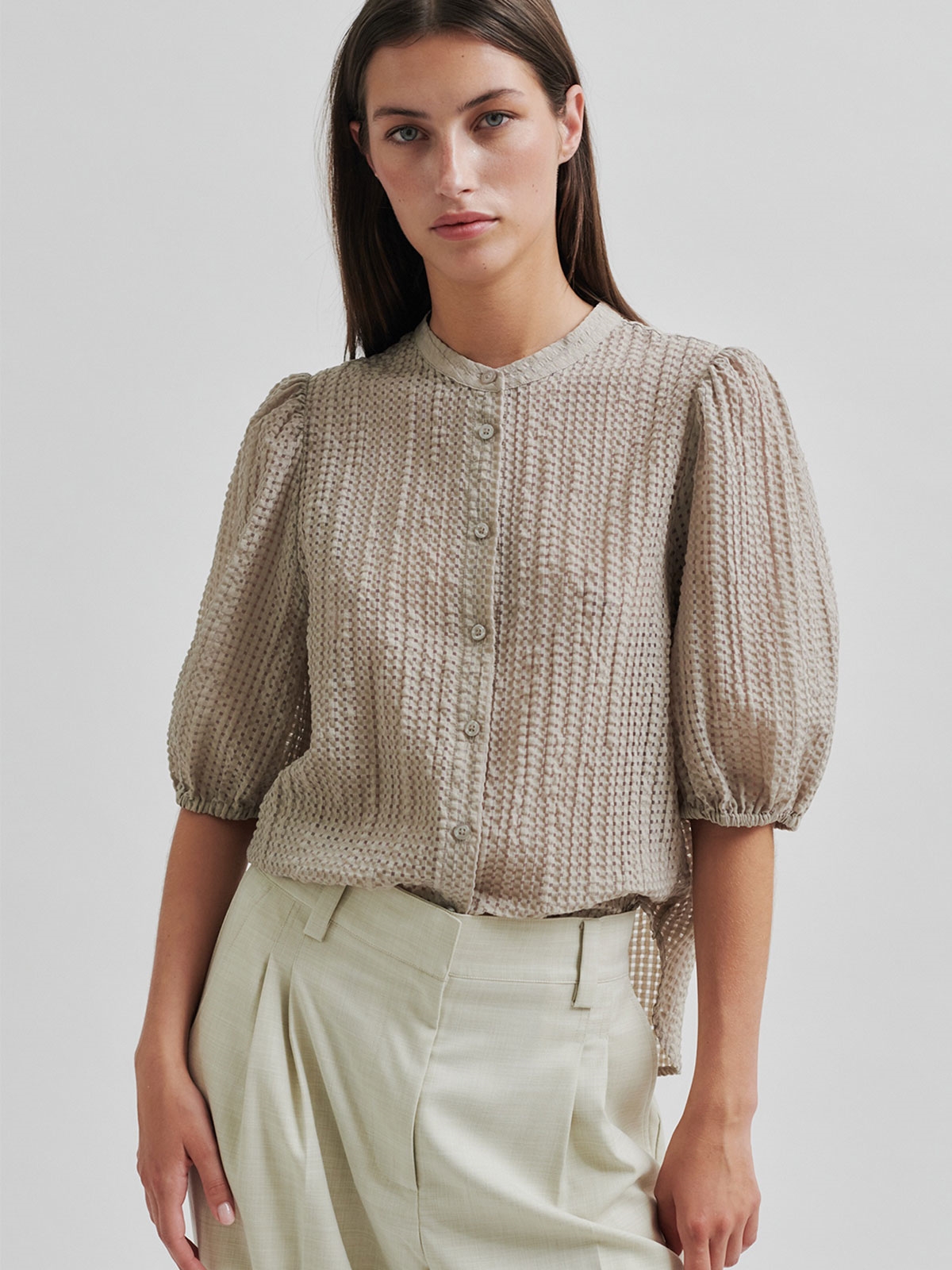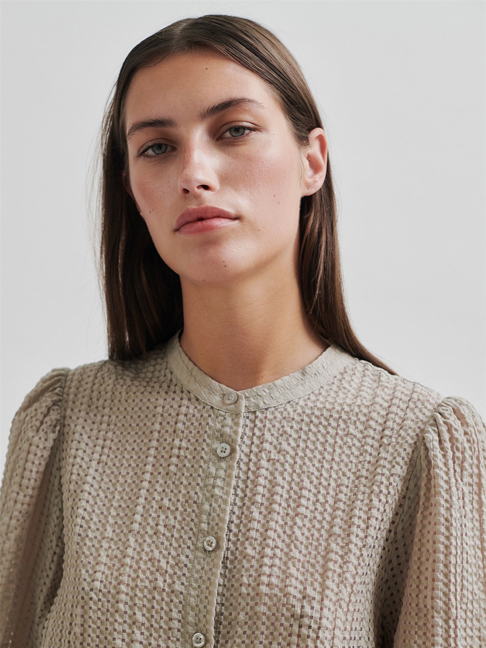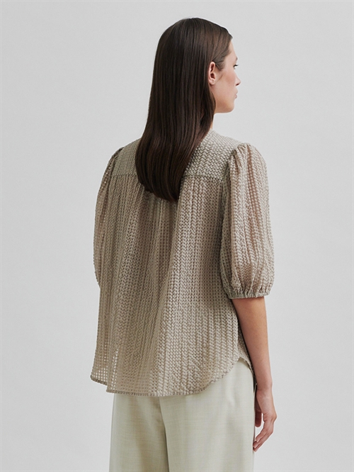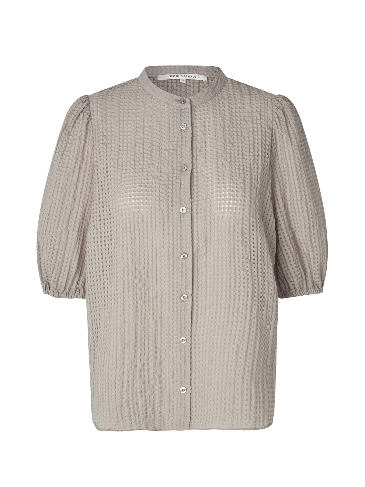 Skjorte fra Second Female. Skjorten har rund hals og trekvartlange ærmer med puf skuldre og elastiske manchetter. Den lukkes med knapper. Skjorten har bæk og bølge-struktur og ternet, transparent mønster. Afslappet pasform.
