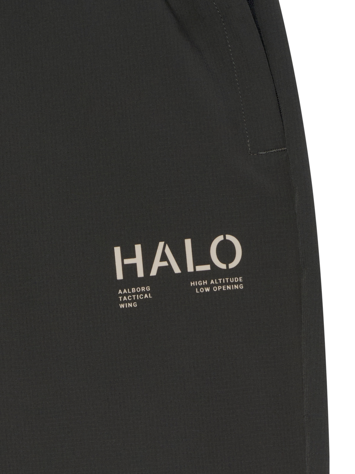 Bukser i ripstop vævet stretch stof fra HALO. Bukserne har to skrå lommer i siderne der lukkes med lynlås. Logo printet på venstre lår. Bukserne har elastik og snøre i taljen samt justerbare kanter ved anklerne.