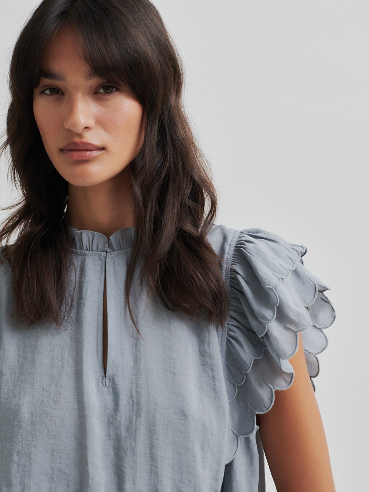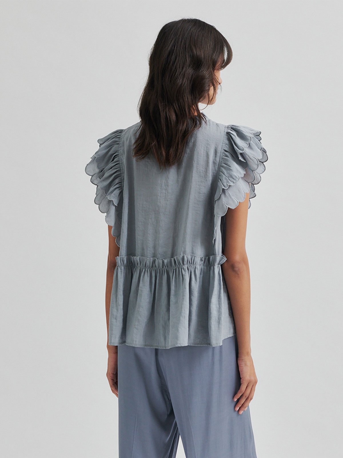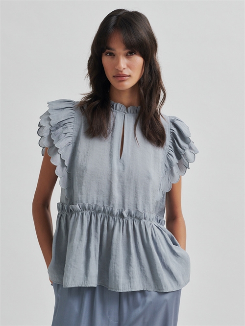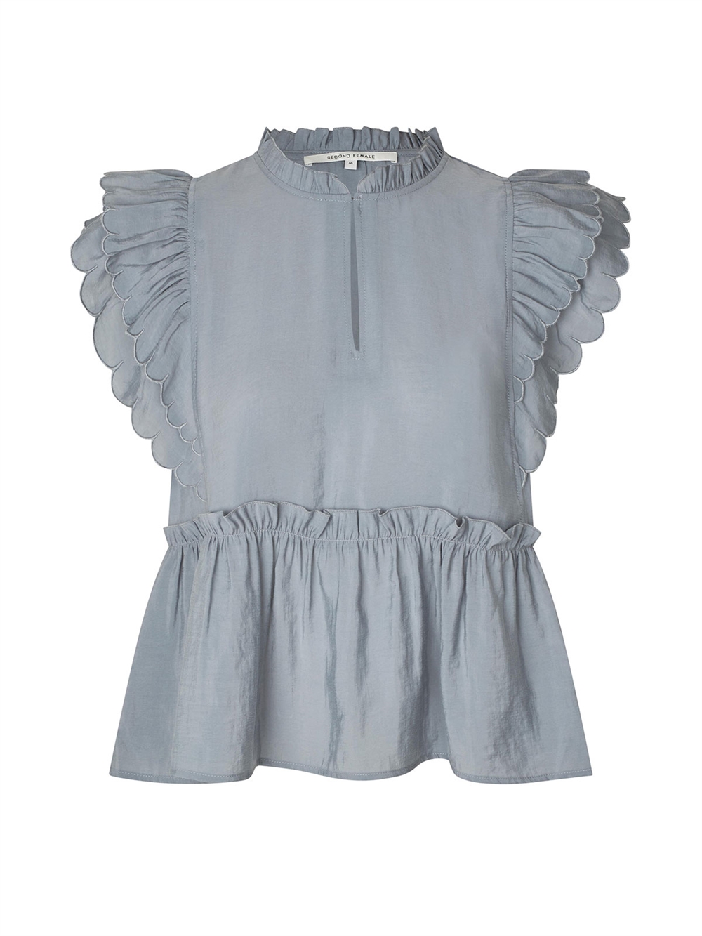 Top fra Second Female. Denne top har v-hals og flæsedetaljer ved hals, skulder og talje. Afslappet pasform.