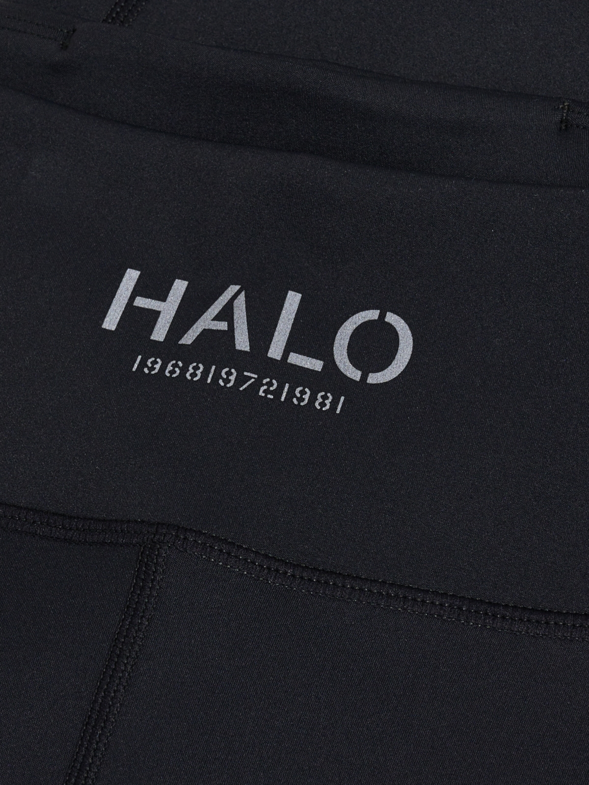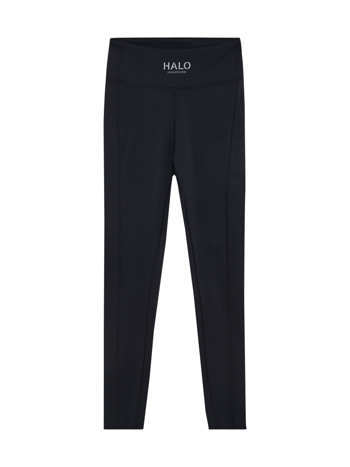 Tights fra HALO. Disse tights har reflekterende tryk foran samt bag på højre ben. De er fremstillet i behageligt jersey stof, som giver god fleksibilitet. De har en mobil lomme i venstre side samt baglomme på indersiden.