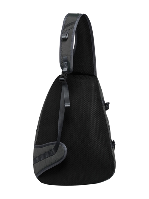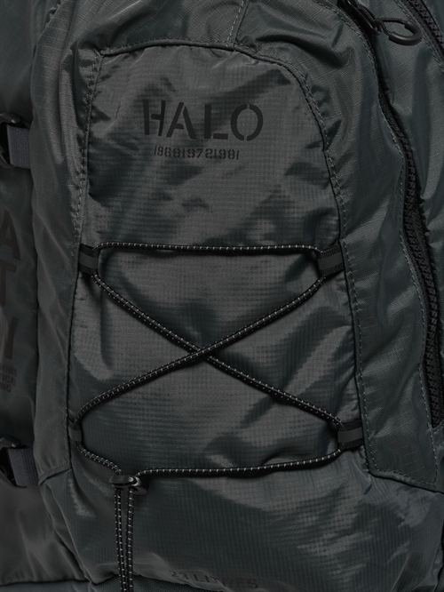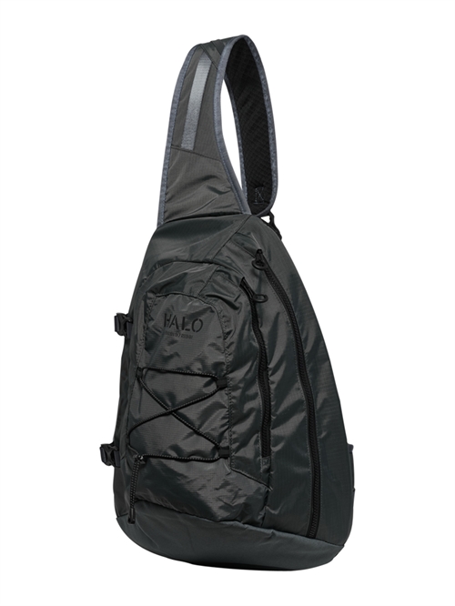 Taske fra HALO. Tasken har et 10 liters hovedrum med lynlåslukning, to udvendige lynlåslommer samt en indvendig lomme med velcrolukning. Den kan justeres i siden med spænder og stropper og den har en elastikdetalje foran til ekstra opbevaring. For ekstra holdbarhed er bunden forstærket. I bagpanelet er der skum-mesh for ekstra komfort og den har en justerbar one-shoulder strop. Reflekterende HALO logo.