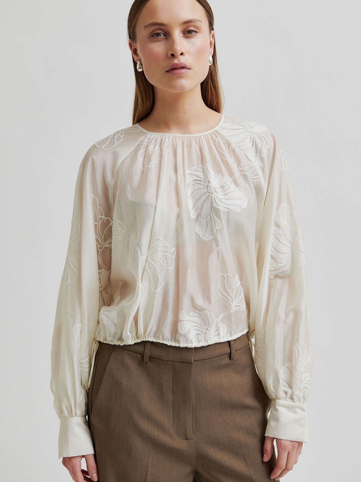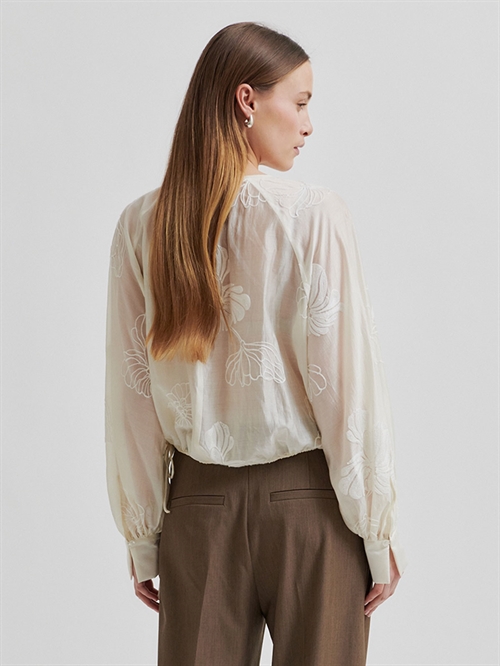 Broderet bluse fra Second Female. Denne bluse har rund hals og nøglehulsåbning med knaplukning bagpå. Den er halvtransparent med broderier . Blusen har lange raglan ærmer med rynke effekt samt med knaplukning ved manchetter. Løs pasform der kan snøres ind forneden med løbegang og snøre i begge sider.