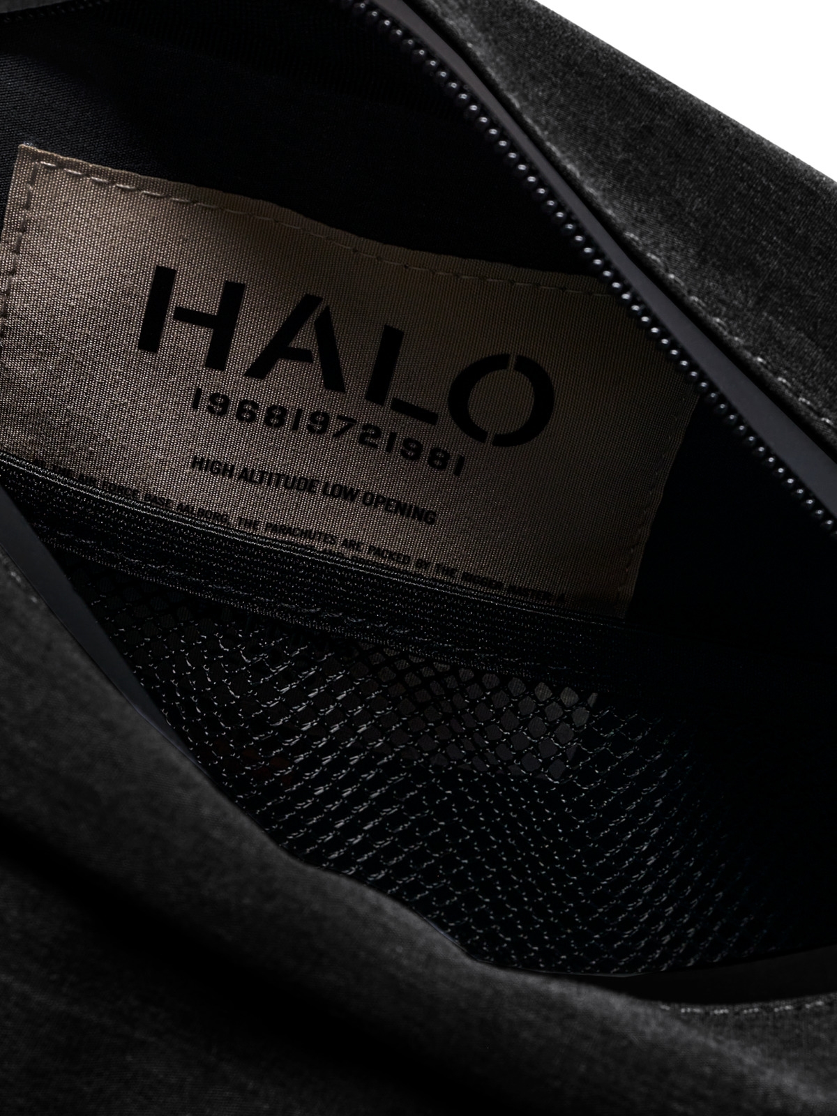 Toilettaske fra HALO. Denne taske er lavet i en slidstærk bomuldsblanding. Den har trykt foran og bagpå. Den har et hovedrum der lukkes med lynlås samt en lynlåslomme på ydersiden. Den er praktisk og funktionel.