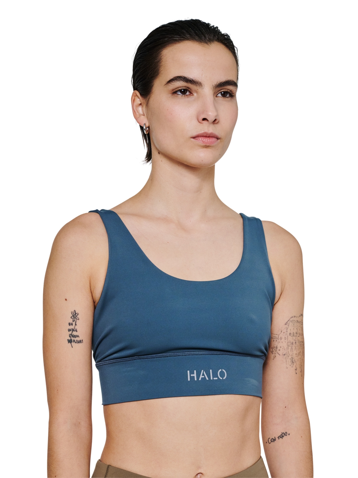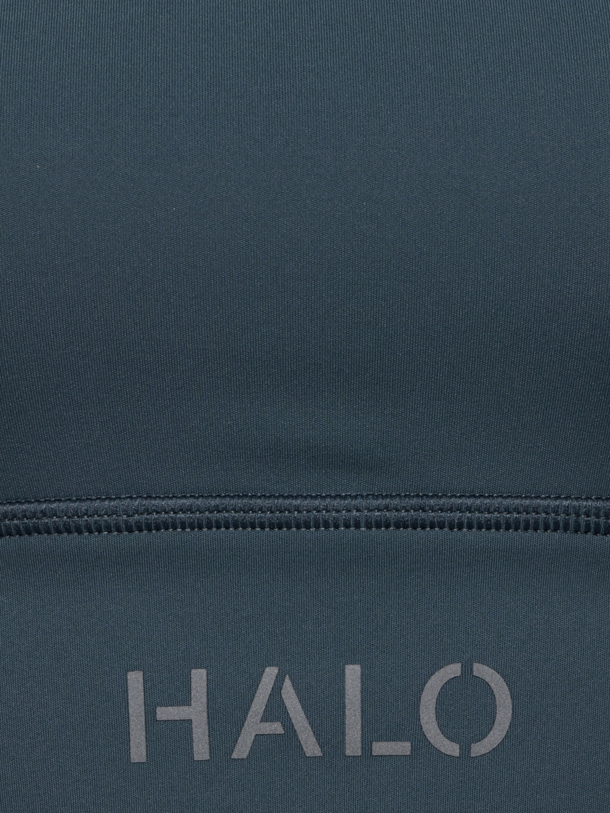 Sports bh fra HALO. Toppen er fremstillet i jersey materiale med dobbelt lag. Den er fleksibel og har god komfort. Toppen har reflekterende logo og tryk foran og bagpå.